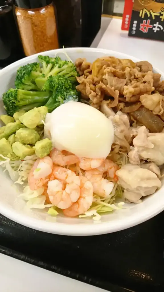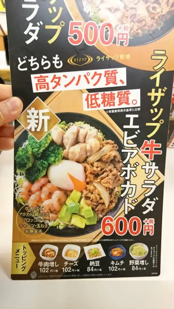 普段は私、松屋ばかりで、南口の吉野家は初めてです。ライザップサラダを注文しました。